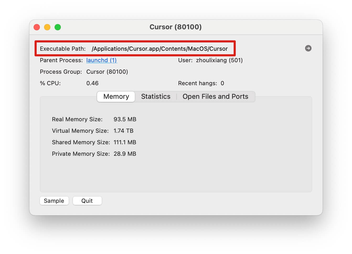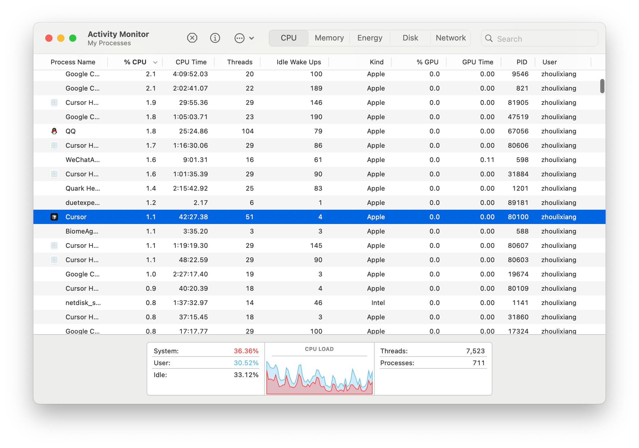 - 打开 MAC 自带的活动监视器,在进程中找到 Cursor 并双击: